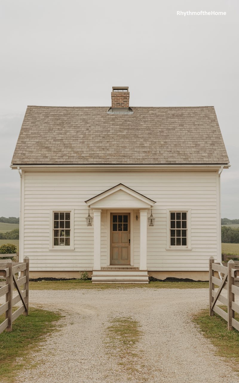 Simplicity is the ultimate sophistication in this modest, white clapboard cottage. It stands alone against a backdrop of rolling fields, evoking the spirit of early American schoolhouses or farmhouses. The roof is a simple gable covered in textured shingles, with a single central brick chimney hinting at a hearth inside. The front porch is minimal, a small gabled shelter supported by thin posts, protecting a wooden door with window panes. A rustic wooden fence lines the foreground, and the gravel driveway crunches underfoot. It is a picture of solitude and peace, stripping away excess to reveal a pure, functional form.