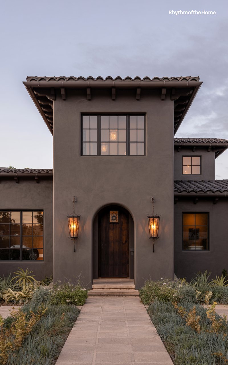 This residence captures the romance of Spanish Colonial Revival architecture with its smooth, dark grey stucco walls and heavy timber accents. The focal point is the central square tower, which rises above the main roofline and features a trio of windows that likely flood a stairwell or upper room with light. Below, a deep, arched entryway draws the visitor in, flanked by ornate iron lanterns that cast a golden glow against the dark facade. The roof is clad in traditional barrel tiles, and the garden path is lined with drought-tolerant plants, reinforcing the Mediterranean aesthetic.