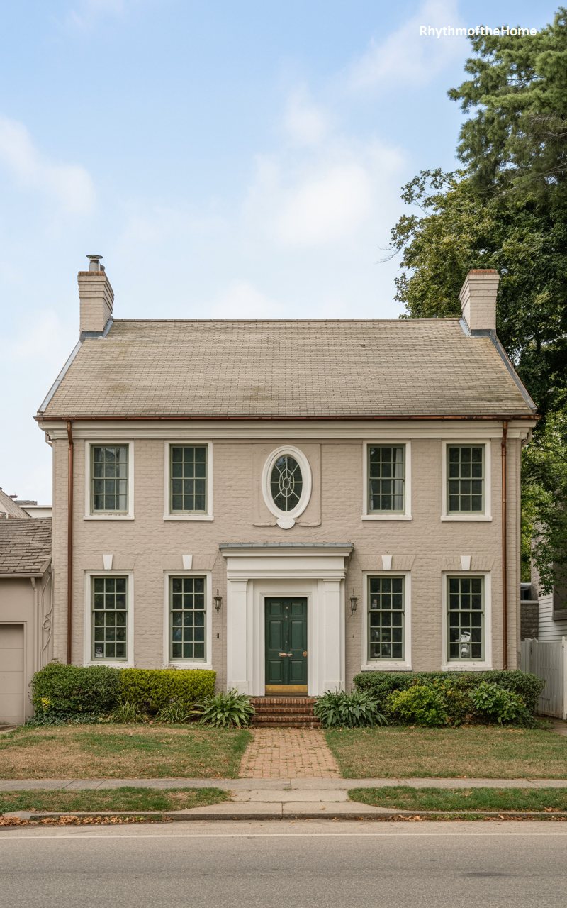 Classic symmetry defines this Federal-style residence, constructed from beige painted brick. The standout architectural feature is the central oval “oculus” window on the second floor, framed by decorative molding, which sits directly above the main entrance. The entry portico features white pilasters and a simple entablature, framing a dark green door that adds a subtle touch of color. A steep, shingled roof caps the structure, with chimneys rising at the ends. The home feels timeless and restrained, sitting peacefully behind a green lawn and a paved sidewalk.