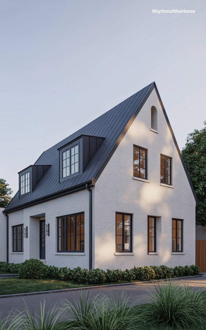 This home reimagines traditional forms with a bold, contemporary edge. The exterior is a stark, clean white stucco, contrasting sharply with the dark, charcoal-colored metal roof. The roofline is dynamic, featuring a steep, asymmetrical pitch that creates a dramatic silhouette against the sky. Black-framed windows are arranged to punctuate the white walls with geometric precision. A small dormer window breaks up the roof plane, adding visual interest. The landscaping is lush and low, softening the base of the home and grounding its sharp, modern lines in nature.