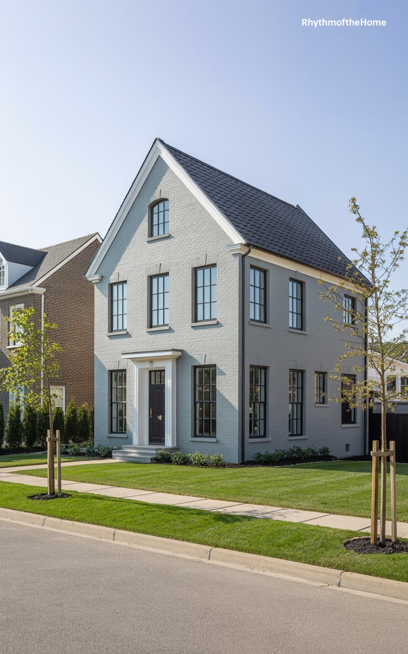 Situated prominently on a corner lot, this home features painted grey brick that gives it a fresh, updated appearance. The main body of the house is two stories, with a steep, gabled roof clad in dark grey shingles. Black shutters flank the white-framed windows, adding depth and traditional detailing. A classic white entrance surround with a pediment marks the front door. To the side, a single-story wing extends the living space. The lawn is impeccably manicured with striped mowing patterns, enhancing the estate-like feel of the property.