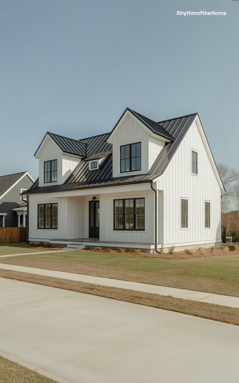 Bright and airy, this home embraces the modern farmhouse trend with its crisp white vertical siding and contrasting black metal roof. The structure is composed of intersecting gabled forms, creating a multi-layered roofline that adds visual complexity. Black-framed windows pop against the white walls, offering a graphic, modern look. A inviting front porch is tucked under the roof overhang, providing a sheltered spot to enjoy the outdoors. The expansive lawn in the foreground creates a green base for the pristine white architecture, making it shine in the sunlight.