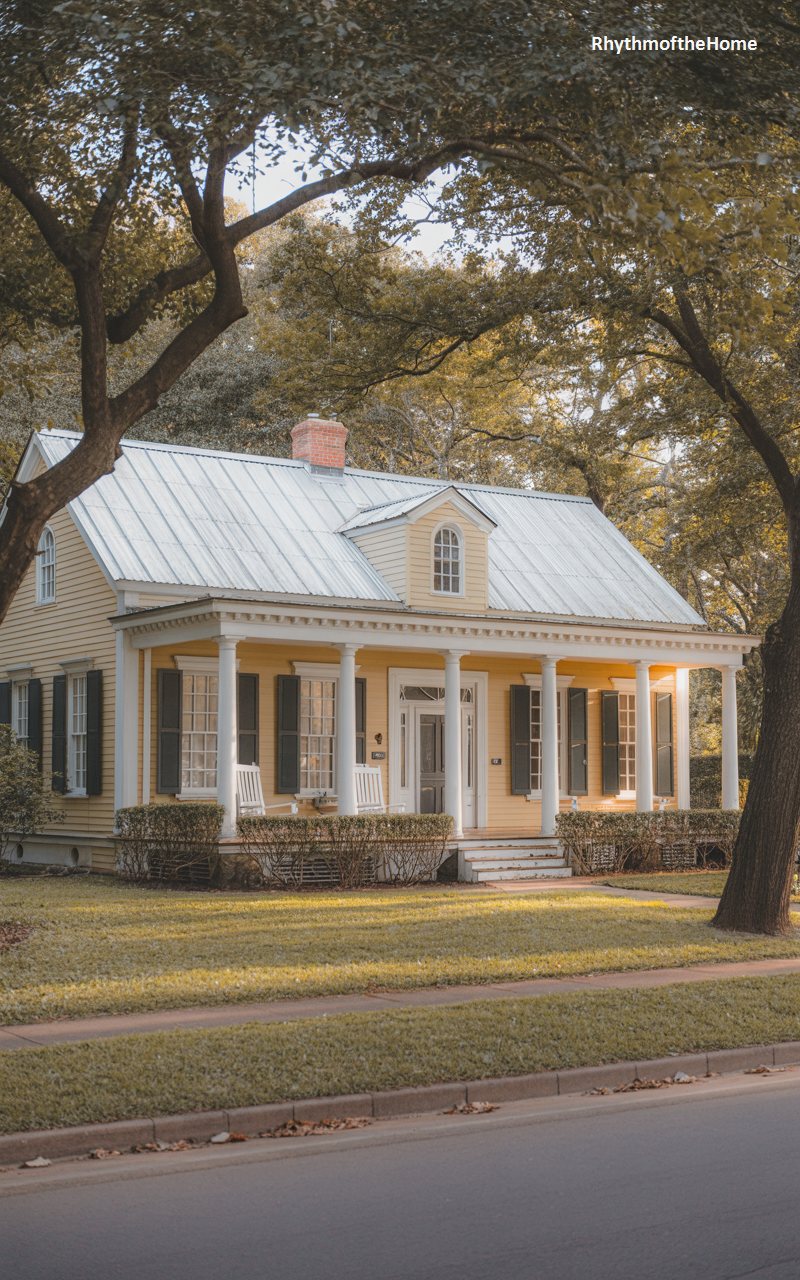 Cheerfulness radiates from this charming cottage, clad in yellow clapboard siding. A silver metal roof reflects the sky and sheds rain efficiently, while a wide, covered porch spans the entire front of the house, inviting lazy afternoons in a rocking chair. The porch is supported by classic white columns, resting on a sturdy stone foundation that adds rustic texture. Dark shutters frame the windows, grounding the bright yellow hue. Nestled under the canopy of large trees, the home feels like a quintessential Southern retreat, blending comfort with traditional style.