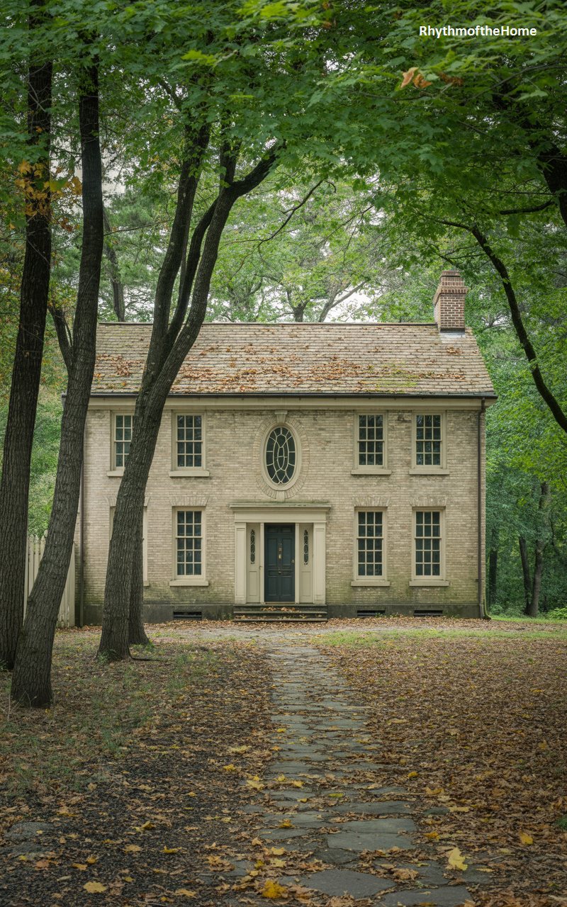 Tucked away in a verdant forest setting, this home is built from pale, textured brick or stone that camouflages it slightly within the woods. A central oval window is a key decorative element on the upper floor, adding a touch of Federal style elegance. The front door is dark, framed by a classic white surround with pilasters. A rustic stone path winds through the leaf-strewn ground leading up to the entrance, reinforcing the connection between the architecture and its natural surroundings. It feels secluded, private, and deeply peaceful.