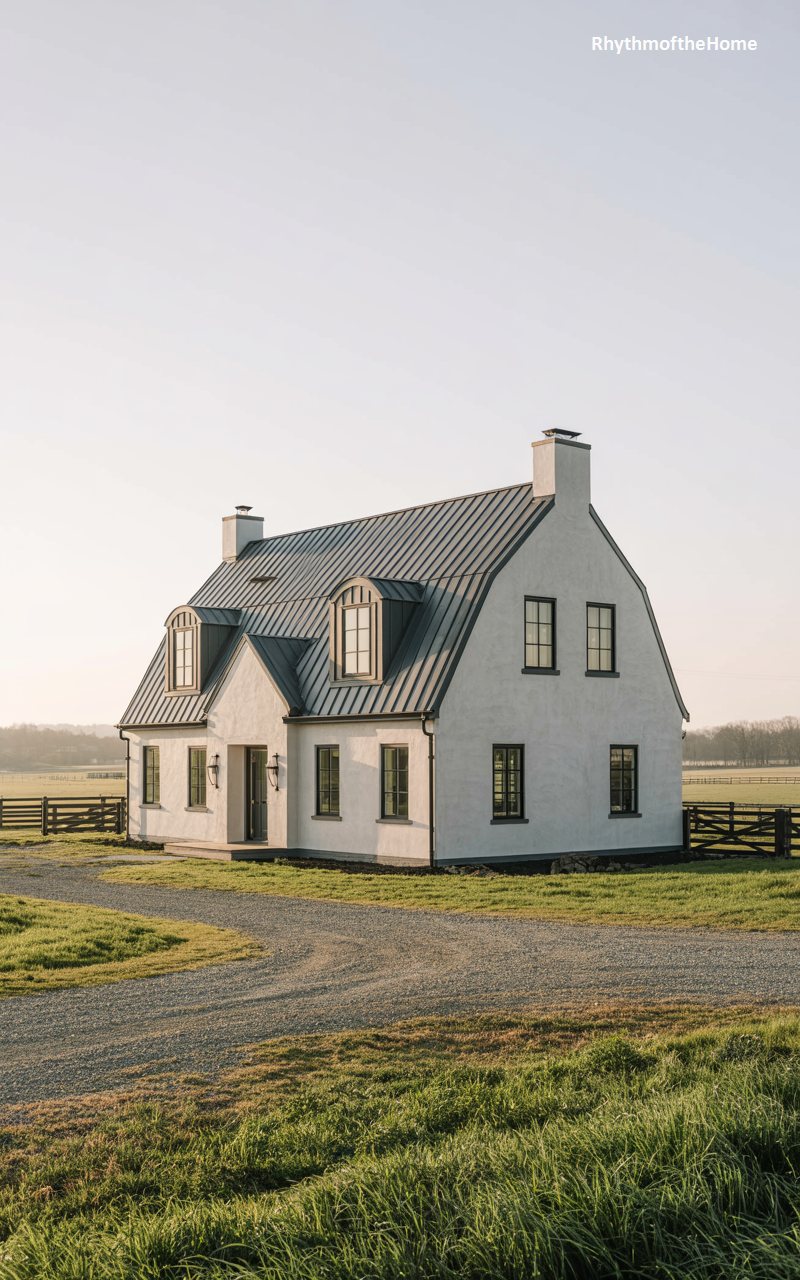 The distinctive gambrel roofline immediately identifies this home as a Dutch Colonial revival. The roof is clad in dark grey standing-seam metal, creating a modern, sleek contrast to the traditional shape. The walls are finished in a smooth, white stucco, keeping the look clean and bright. Dormer windows protrude from the roof, adding volume and light to the upper story. The house sits in a pastoral setting with a gravel driveway and green fields in the distance, blending a barn-like silhouette with refined residential details.