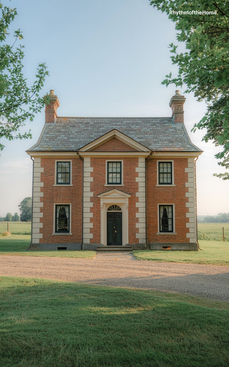 This stately residence showcases the solidity and craftsmanship of traditional brick architecture. The red brick facade is accented with lighter stone quoins at the corners, a detail that adds visual strength and decoration. The roof is slate, with two chimneys rising symmetrically at either end. The central entrance is sheltered by a pedimented porch with white columns. The lighting suggests early morning or late afternoon, casting long shadows and highlighting the texture of the brick and the lush green of the surrounding trees.