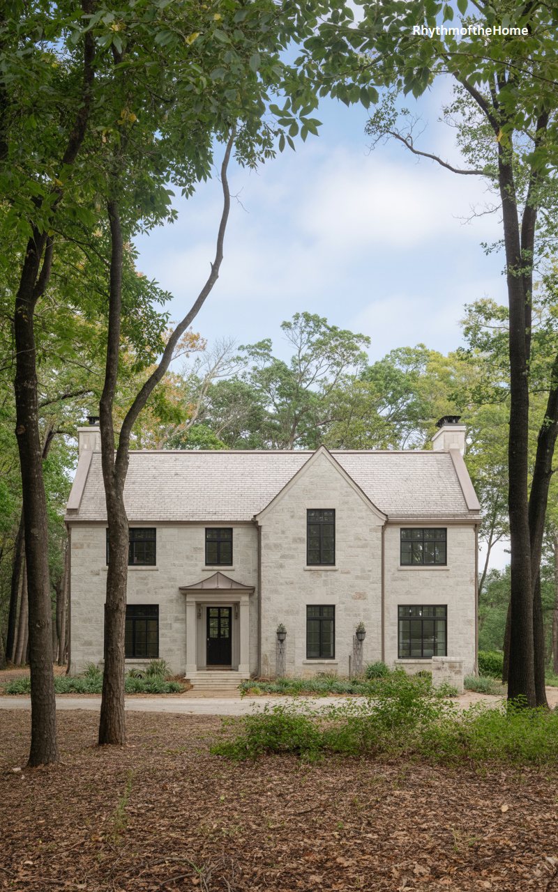 This elegant home combines the rustic texture of stone with refined architectural lines. The exterior is clad in a pale, whitewashed stone or brick, giving it a bright yet textured appearance. Steep gables define the roofline, and the dark grey shingles provide a sharp contrast. Black-framed windows add a modern touch to the traditional form. Tall, slender trees frame the house, casting dappled shadows on the facade. It feels like a modern interpretation of a forest cottage, blending seamlessly with the vertical lines of the surrounding woods.