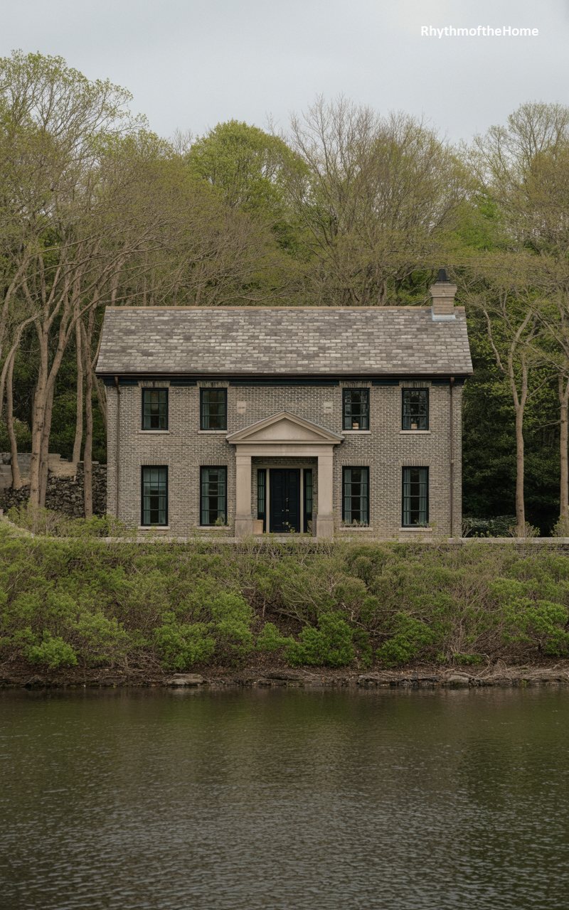 Sitting at the water’s edge, this home features a facade of grey brick that mirrors the cool tones of the lake or river in the foreground. The slate roof adds to the monochromatic, sophisticated palette. A central classical portico with stone columns creates a formal entrance, while black-framed windows provide a rhythmic balance. The house is surrounded by dense greenery, making it feel like a private retreat. The reflection of the house in the water adds a layer of tranquility and depth to the image.