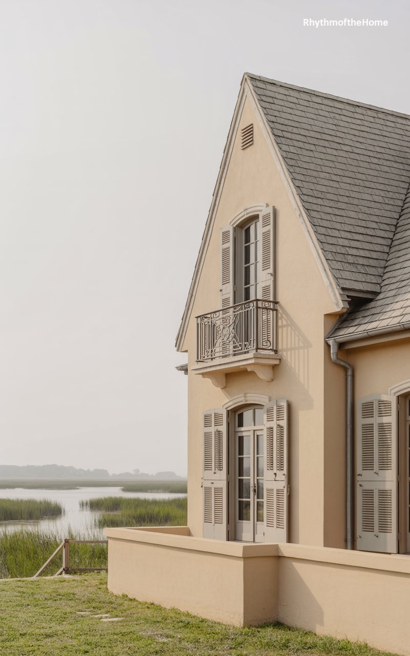 Rising vertically against a pale sky, this home features a smooth, cream-colored stucco exterior. The steep, slate-tiled roof dominates the silhouette. A standout feature is the second-story balcony with an intricate iron railing, accessible via tall French doors, offering views over the marshland visible in the background. On the ground floor, louvred shutters flank the doors, adding texture and functionality. A low wall encloses a terrace, providing a defined outdoor space that overlooks the water and reeds. It feels elegant and serene.