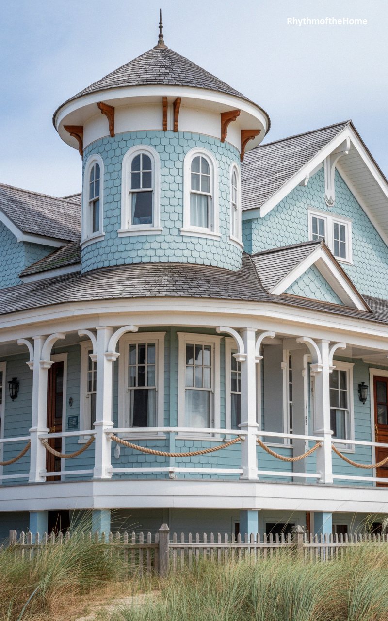 Merging Victorian architecture with seaside charm, this unique Queen Anne home features a refreshing sky-blue exterior entirely enveloped in textured wood shingles. A prominent circular tower dominates the left side, capping with a sweeping, bell-shaped roof. The deep, wrap-around porch is supported by stark white, elegantly curved brackets and columns, but it trades traditional wooden balusters for a thick, nautical rope railing that drapes lazily between the posts. Nestled behind a rustic wooden fence and tall, swaying beach grasses, this residence perfectly captures the relaxed yet ornate spirit of a historic coastal retreat.