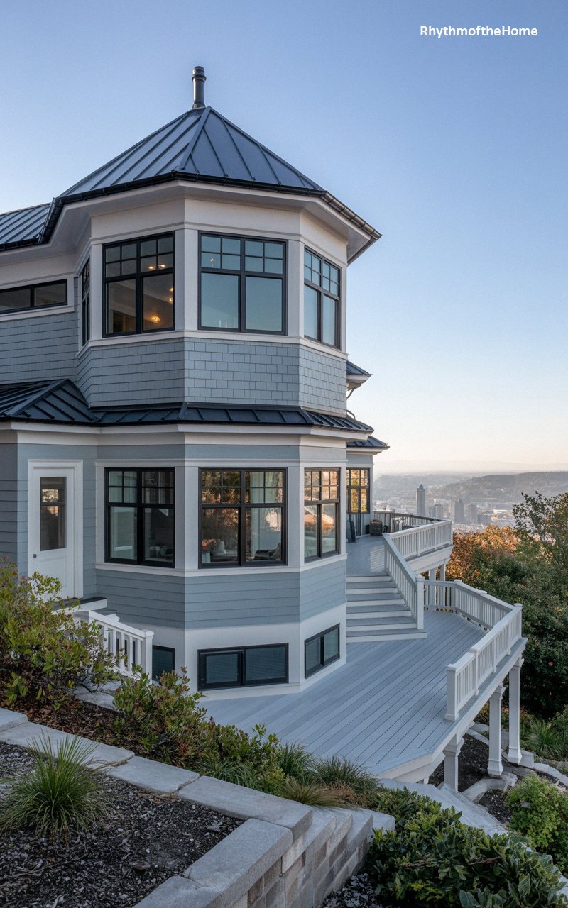 Perched thrillingly on the edge of a steep incline, this magnificent home offers unparalleled, sweeping views of the distant city skyline. The exterior is updated in a soothing, pale slate-blue siding, sharply defined by crisp white trim and a modern, black standing-seam metal roof. The architecture is anchored by a prominent octagonal tower, wrapped in expansive, dark-framed windows to capture the breathtaking panorama. Replacing a traditional covered porch, a vast, modern, multi-level grey composite deck wraps around the structure, providing the ultimate outdoor entertainment space while maintaining the elegant, towering historic silhouette against the sky.