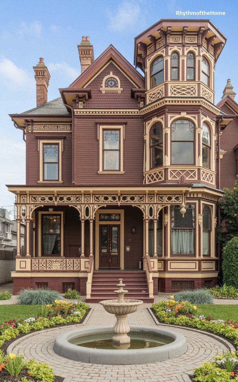 This majestic Queen Anne home is a showstopper, painted in a deep, luxurious burgundy that makes its ornate tan and gold trim pop spectacularly. The facade is a symphony of Victorian textures, featuring elaborate fretwork, delicate spindle friezes, and a complex array of overlapping gables. A stunning two-story corner bay extends outward, capped with an intricately detailed turret that commands the street. The grandeur of the architecture is matched by the manicured grounds, where a circular brick pathway wraps around a classic tiered stone fountain, surrounded by a vibrant, blooming garden of yellow and red flowers.