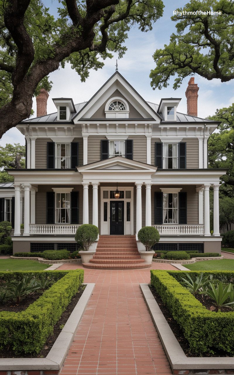 Framed by the sprawling, moss-draped branches of ancient oak trees, this elegant Queen Anne home offers a rare touch of symmetry in its design. The exterior is clad in muted taupe siding with striking white and black accents. A prominent central gable, complete with a beautiful arched Palladian window, sits proudly above a classical pediment marking the front entrance. The wide, welcoming porch is supported by stout, fluted columns and features a simple, classic balustrade. A perfectly manicured garden with low boxwood hedges and a broad brick pathway leads to the grand, welcoming black front doors.