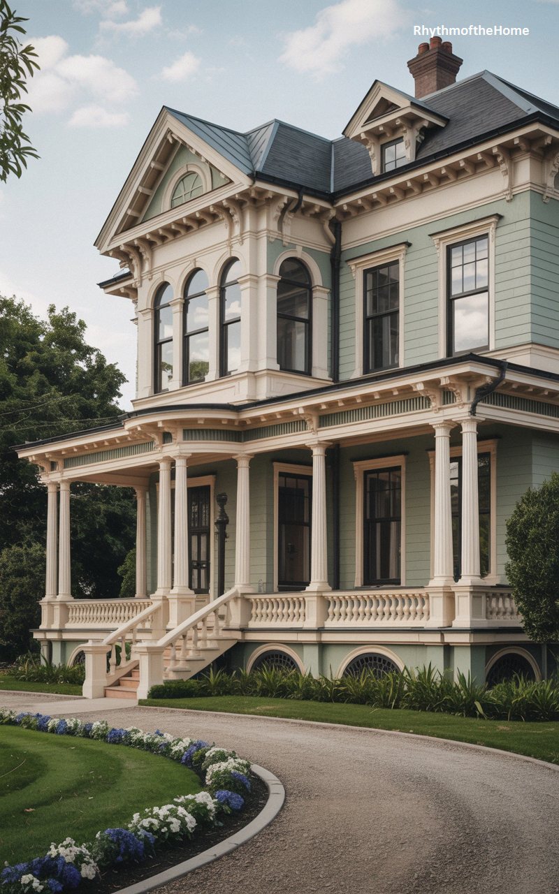Elegance meets Victorian charm in this breathtaking mint green Queen Anne home. The structure features a masterfully designed wrap-around porch that curves seamlessly along the facade, supported by elegant cream-colored columns and a finely detailed balustrade. The second floor boasts large, arched windows that add a touch of Italianate flair to the complex architecture. Elaborate corbels and dentil molding decorate the overhanging eaves, while a steeply pitched roof adds dramatic height. A sweeping, curved gravel driveway borders a meticulously trimmed lawn, lined with a colorful array of blooming blue and white hydrangeas that complement the home’s pastel palette.
