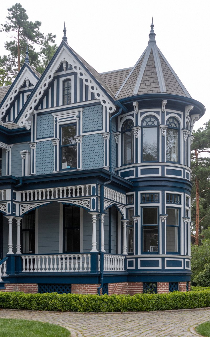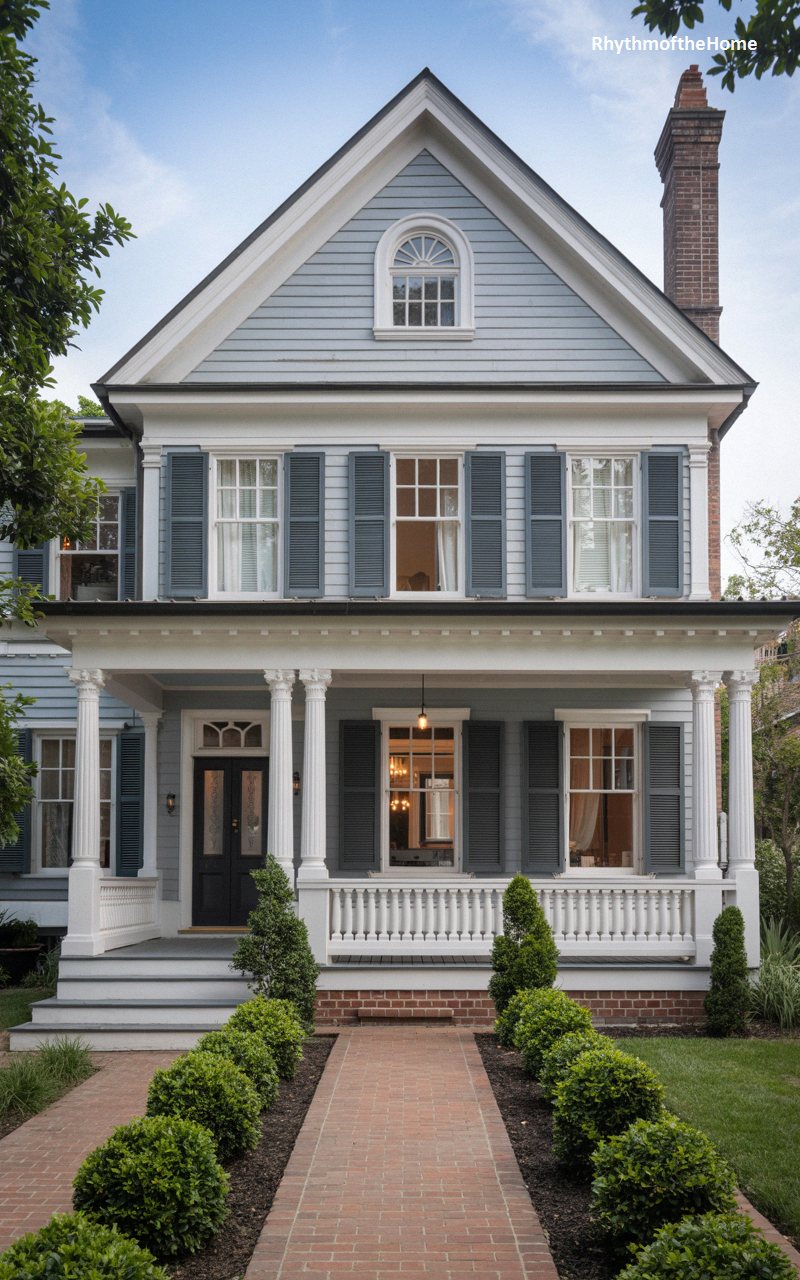 This charming Queen Anne home beautifully blends Victorian detailing with a touch of colonial restraint. Painted in a soothing slate blue with crisp white trim, the facade is incredibly welcoming. The front porch features elegant classical columns and a clean, traditional balustrade, while the upper level showcases dark, contrasting window shutters and a lovely arched window nestled into the steep front gable. A tall, sturdy brick chimney anchors the right side of the steep roofline. A pristine red brick pathway, flanked by perfectly spherical boxwood shrubs, leads the eye directly to the dramatic, dark front door.