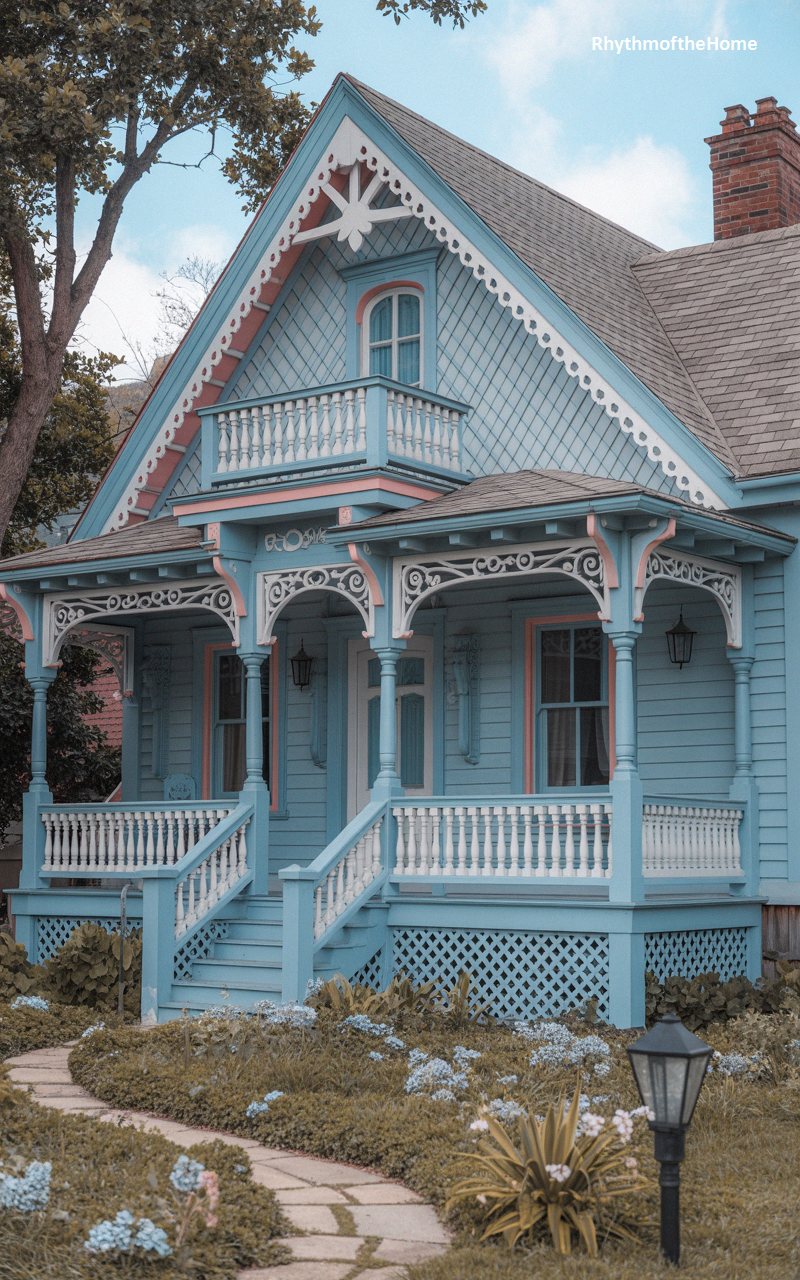 This charming Queen Anne home looks as though it was plucked straight from a fairy tale, adorned in a whimsical palette of sky blue with soft pink and stark white accents. The steeply pitched front gable is a canvas for elaborate, lacy bargeboard trim that frames a delicate upper-level balcony. Below, the welcoming front porch features exquisite gingerbread cutouts and elegantly turned posts. A winding stone path, bordered by low-lying blue flora and lush greenery, leads to the inviting entrance. The playful use of color and intricate woodwork exemplifies the joyous, decorative spirit of the Victorian era.
