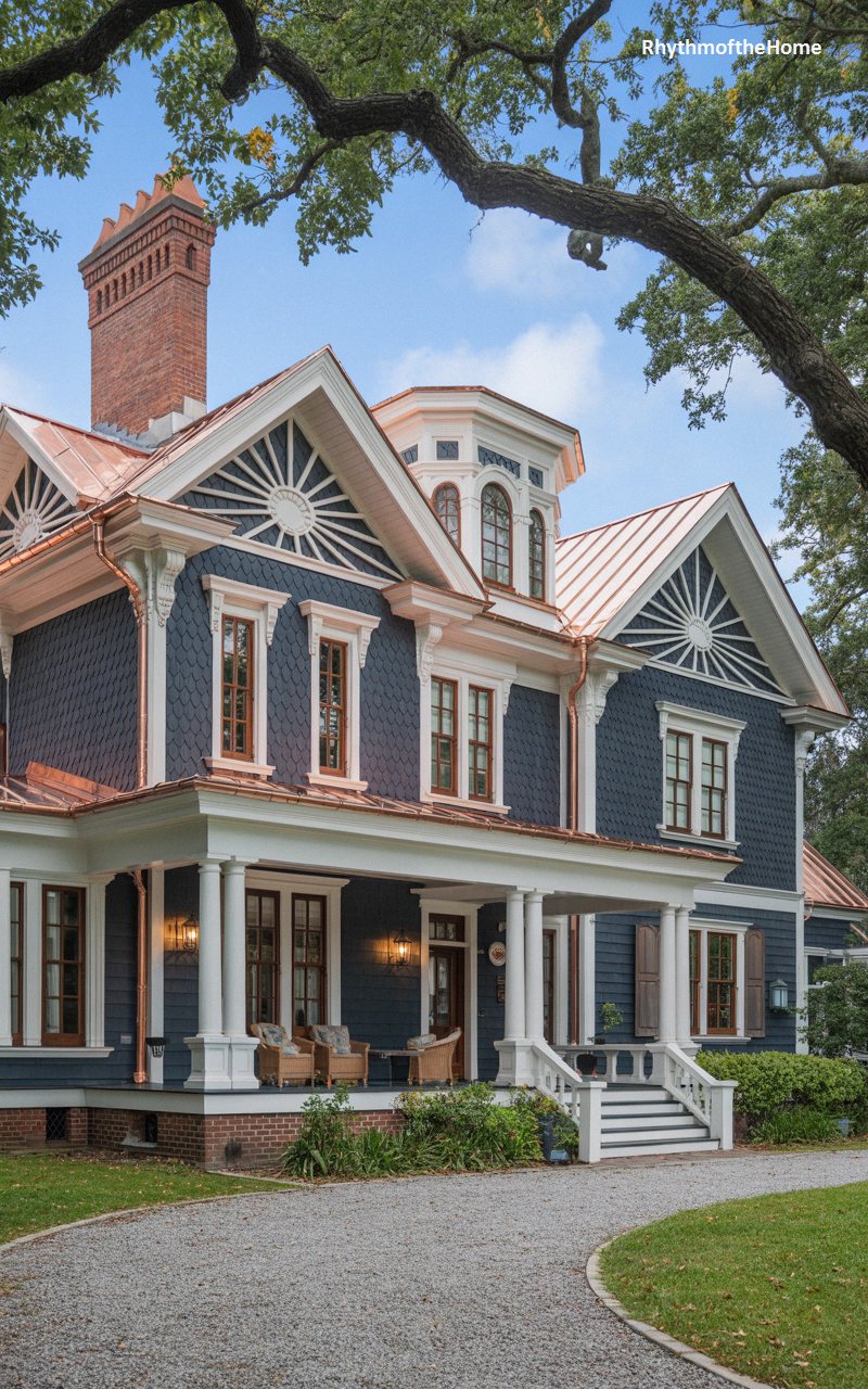 Anchored by a stunning copper roof that shines against the sky, this dark navy Queen Anne home masterfully balances bold color with elegant details. The exterior walls are heavily textured with layers of scalloped and staggered shingles, contrasting sharply with the crisp white trim. Spectacular sunburst motifs radiate within the steep front gables, adding dynamic visual interest. A sweeping wrap-around porch features stark white columns and cozy wicker furniture, creating an inviting outdoor living space. Framed by the sprawling branches of ancient, moss-draped oak trees, this home exudes a sense of stately, enduring southern grandeur.