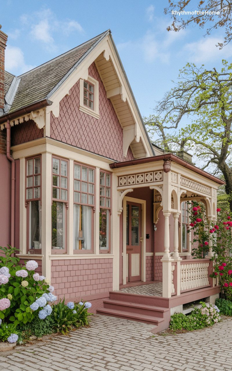 Bursting with romantic appeal, this dusty rose Queen Anne home is nestled amidst a vibrant garden of blooming pink roses and blue hydrangeas. The warm pink facade features a beautiful mix of smooth clapboard and textured, scalloped shingles in the gables. An intricate, lace-like porch spans the front, supported by delicately turned columns and featuring exquisite cutout spandrels. A prominent bay window extends outward, flooding the interior with natural light. The cream-colored trim perfectly highlights the complex architectural woodwork, while a textured cobblestone driveway leads right up to the welcoming, pink-painted wooden steps of this idyllic sanctuary.