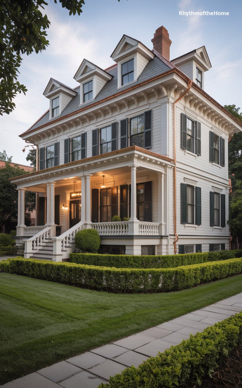 Standing with stately grace, this radiant white residence merges classic symmetry with Victorian sensibility. The crisp facade is handsomely contrasted by dark, louvered shutters and the warm, metallic gleam of copper gutters lining the roofline. A deeply welcoming front porch, supported by elegant classical columns and a refined balustrade, invites lingering evening conversations under the soft glow of pendant lanterns. Three prominent dormer windows peer from the slate-tiled roof, while elaborately carved brackets support the overhanging eaves. Bordered by a meticulously manicured, low boxwood hedge, this architectural gem exudes a timeless, sophisticated charm.