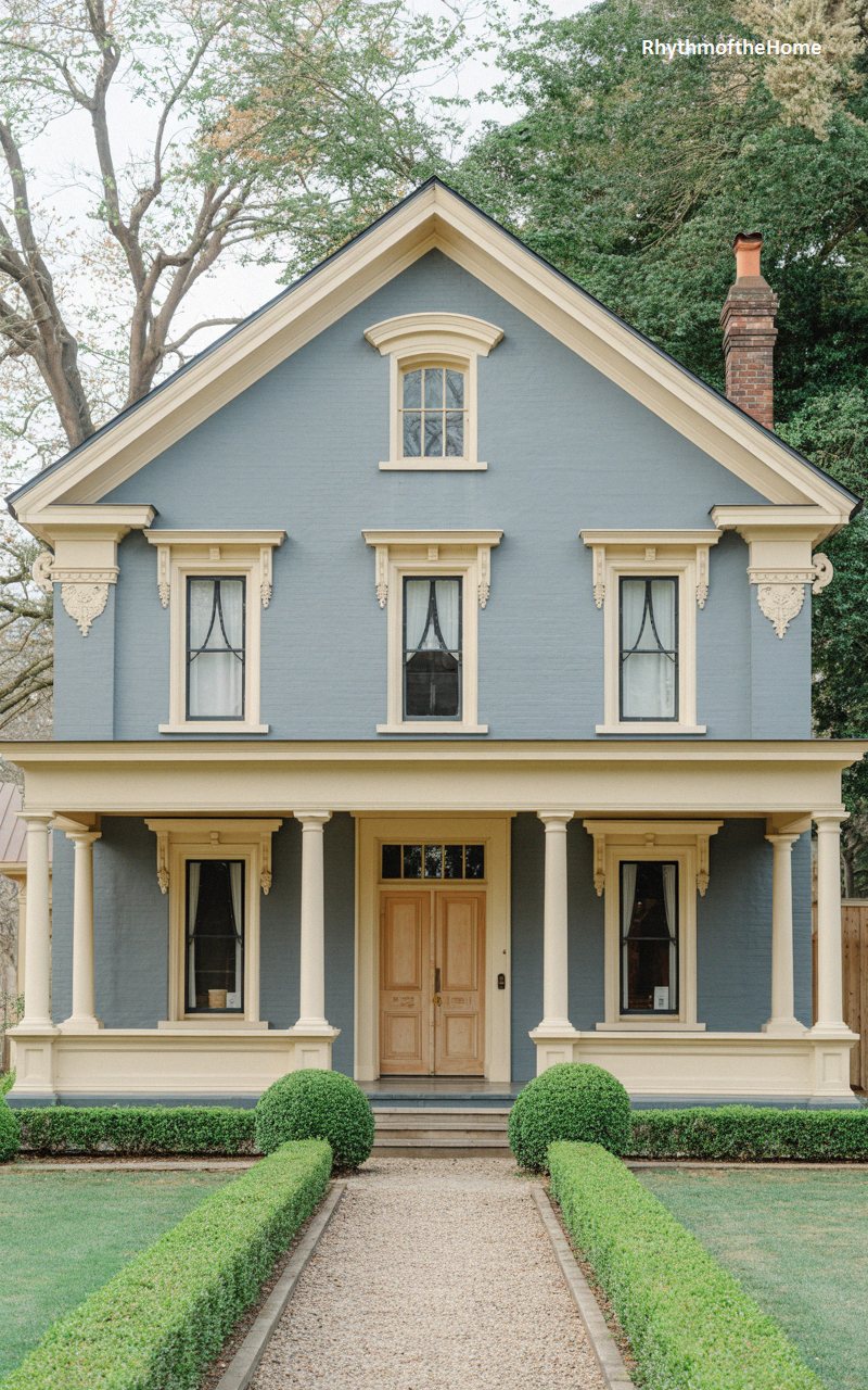 Exuding a quiet, historic charm, this slate-blue residence features an unusually symmetrical approach to the often-eclectic Victorian aesthetic. The smooth, muted facade is beautifully highlighted by soft, buttery yellow trim around the tall, narrow windows, each crowned with an ornate, carved pediment. A robust, full-width front porch boasts sturdy classical columns, creating a deeply shadowed, welcoming entryway featuring grand natural-wood double doors. A tall, textured brick chimney anchors the right elevation. Set behind a pair of perfectly spherical topiary shrubs and a neat gravel path, the property feels like a peaceful retreat from the modern world.