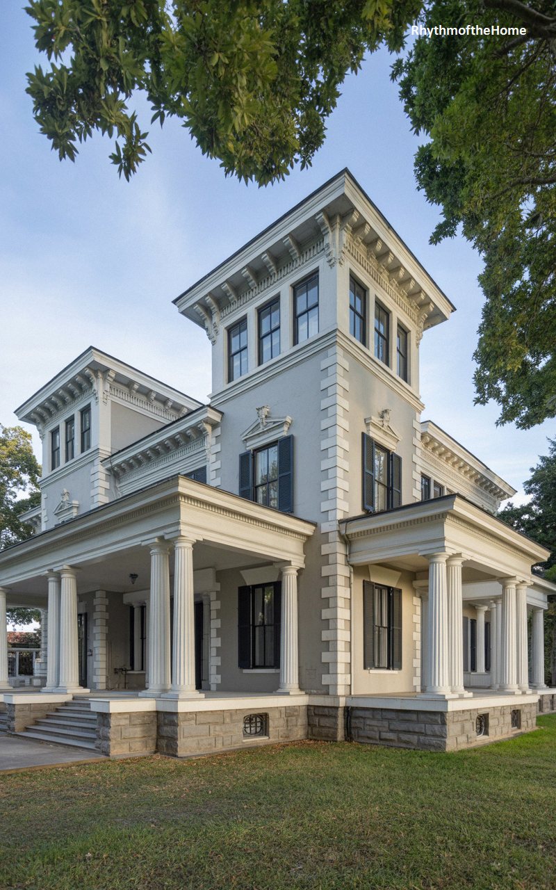 Commanding attention with its impressive verticality, this light gray masterpiece is dominated by a breathtaking square central tower that rises proudly above the main roofline. The facade features a striking contrast between the smooth stucco upper levels, accented with crisp white quoins, and the rugged, heavy stone blocks of the foundation. A magnificent wrap-around porch offers a grand, sweeping entrance, supported by a colonnade of pristine, fluted Doric columns. Dark window sashes provide a sharp visual anchor against the pale walls. Surrounded by mature, leafy trees, this residence projects an aura of established, enduring grandeur.