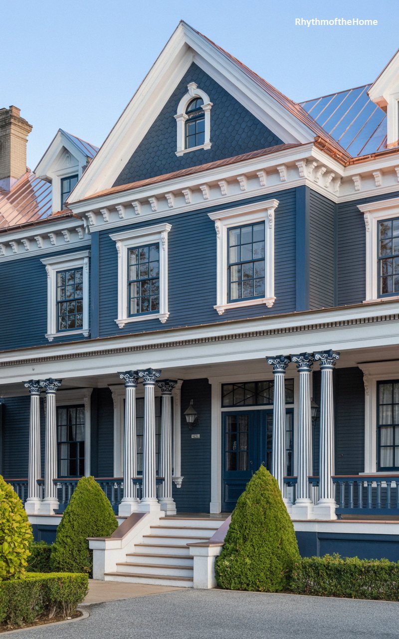 Striking a dramatic pose against the sky, this deep navy blue residence is beautifully crowned by the warm, reflective glow of a copper-accented roof. The steep front gable is clad in textured, scalloped shingles, housing a delicate arched window that looks out over the neighborhood. Below, the expansive wrap-around porch is supported by magnificent, fluted columns adorned with intricately carved, dark-painted capitals. Crisp white trim frames the large, multi-paned windows, providing a sharp, nautical contrast to the dark siding. Symmetrical, cone-shaped evergreens flank the crisp white entrance stairs, completing this bold, impeccably tailored architectural statement.