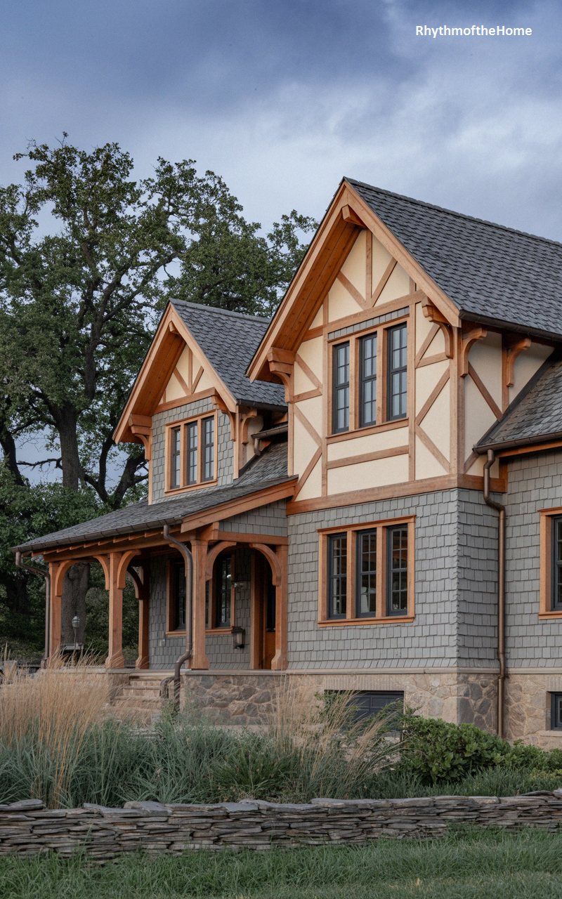 Leaning into a distinctly Tudor-inspired variation of the era, this striking home blends natural textures with complex architectural geometry. The facade features a masterful mix of gray wooden shingles on the lower level and dramatic, cream-colored stucco with exposed structural timbers in the steep gables above. An inviting, deep-set porch is supported by beautifully arched, natural wood braces that echo the craftsmanship of a bygone era. Dark-framed windows group together to let light pour into the interior, while a rugged stone foundation anchors the structure to the earth amidst a meadow of swaying, wild grasses.