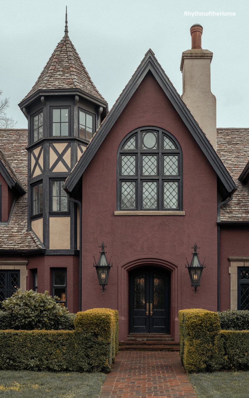 Bathed in a rich, saturated crimson, this moody and magnificent residence commands attention with its bold palette and storybook silhouette. A towering corner turret features striking, dark-stained timbering over a cream background, creating a gorgeous contrast against the dark red stucco. The focal point of the facade is a massive, multi-paned arched window that dominates the central gable, suggesting a grand interior space. Flanked by elegant, gothic-inspired wrought iron lanterns, the dark, recessed double doors offer a mysterious and inviting entrance. The slate-tiled roof adds a final touch of historic authenticity to this enchanting property.