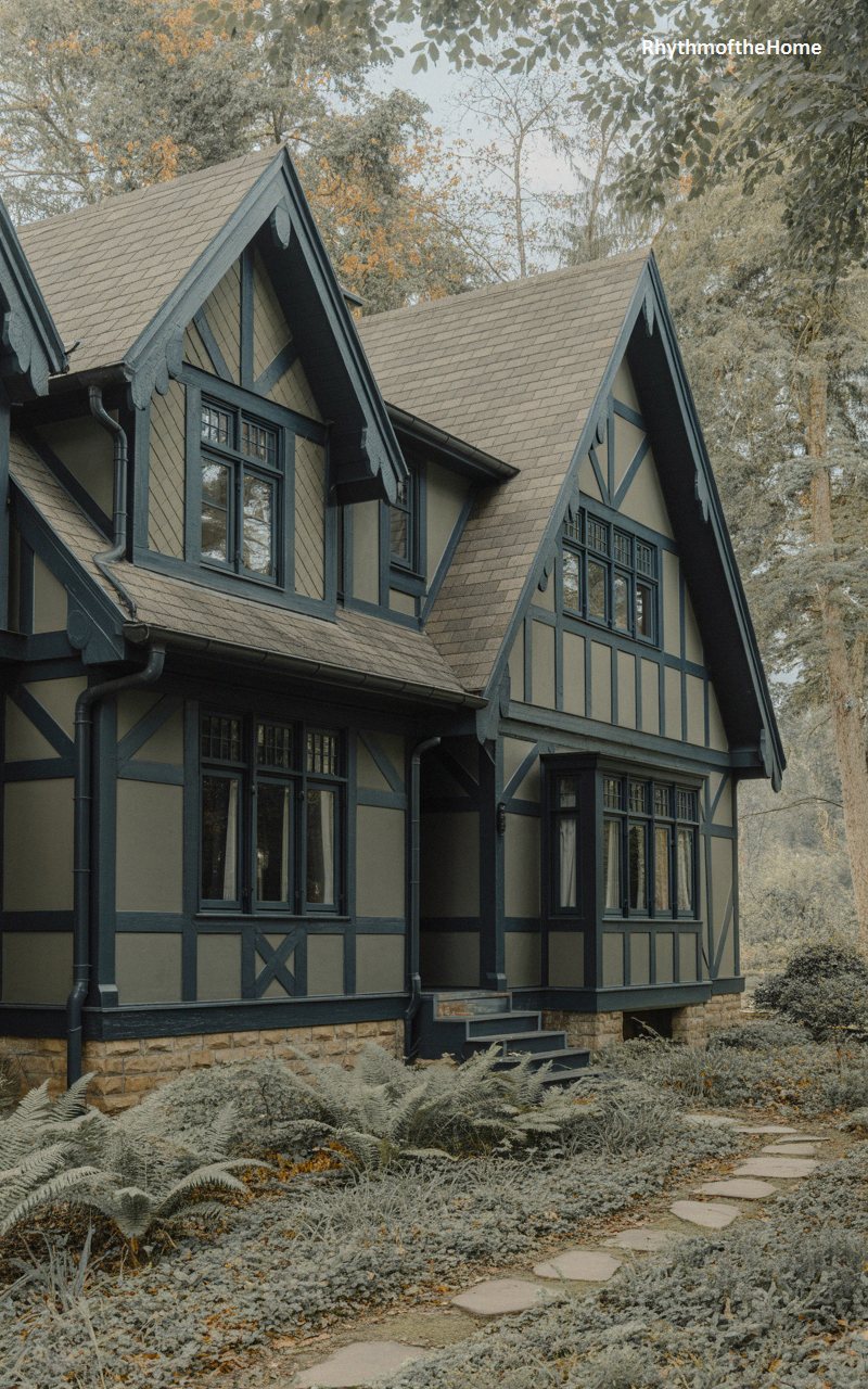Nestled gracefully into its wooded surroundings, this moody, olive-green residence showcases a heavy, romantic reliance on half-timbered styling. The complex, multi-gabled roofline, clad in textured gray shingles, creates a dynamic, asymmetrical silhouette against the sky. Dark, bold timbering crosses the facade, framing elegant banks of multi-paned windows that invite the outside in. A charming projecting bay window adds depth to the ground floor, while the stonework at the foundation roots the home firmly in its landscape. A winding stone path bordered by wild ferns leads to the deeply shadowed, welcoming entrance of this sylvan retreat.