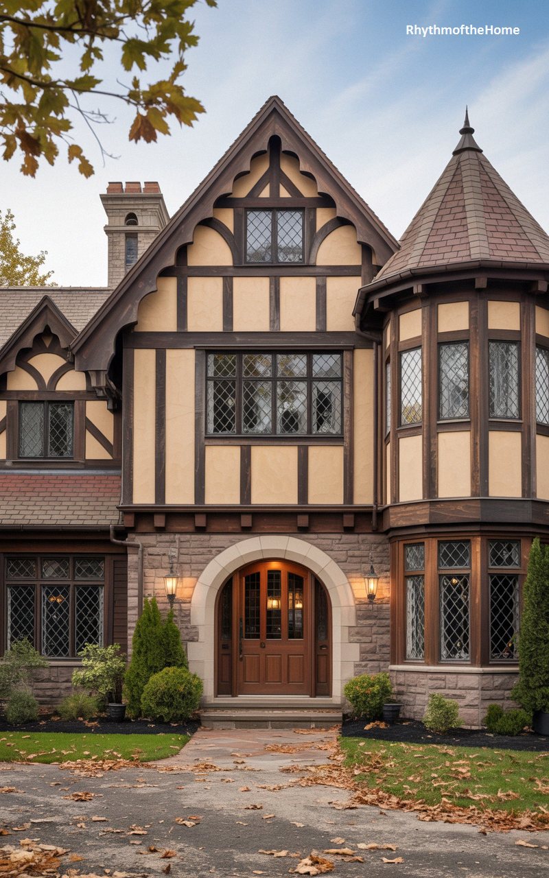Exuding the warmth of an English country manor, this remarkable residence features buttery yellow stucco perfectly contrasted by dark, intricate half-timbering. The structure is a masterclass in asymmetrical design, boasting an array of steep, overlapping gables and a prominent, multi-sided corner turret that anchors the composition. Beautiful diamond-paned windows are scattered across the facade, reflecting the surrounding foliage. The entrance is marked by a sweeping, robust stone archway that leads to warm, glowing wooden doors. Framed by mature trees and a carpet of fallen autumn leaves, this property feels both immensely grand and invitingly cozy.