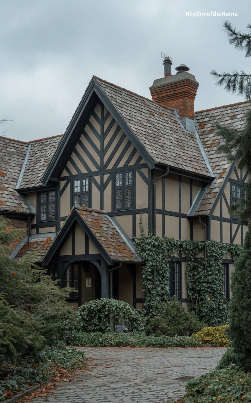 Looking as though it sprouted directly from a fairy tale, this spectacular home is characterized by its dramatic, steeply pitched gables and striking half-timbered details. The warm, taupe stucco is crisscrossed by dark, bold wooden beams arranged in eye-catching chevron and vertical patterns. A massive, textured brick chimney rises prominently alongside the entrance, adding vertical thrust to the design. Thick, verdant ivy climbs the walls and spills over the lower rooflines, blending the architecture with the surrounding forest. A cobblestone driveway leads to a deeply recessed, mysterious entrance, completing the old-world enchantment of this historic estate.