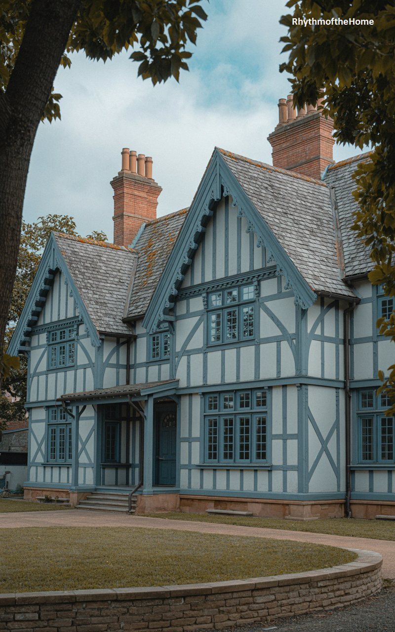 This incredibly picturesque residence utilizes a cool, soothing palette of pale gray-blue stucco intersected by striking, slate-blue half-timbering. The steeply pitched, overlapping gables are trimmed with exquisitely carved, wavy bargeboards that add a touch of playful, storybook whimsy to the roofline. Tall, elegant brick chimneys topped with traditional clay pots reach toward the sky, hinting at cozy hearths within. The home’s entrance is sheltered by a quaint, extended porch supported by sturdy timber posts. Set back from a sweeping gravel drive and framed by the dappled light of overhanging trees, this home is a tranquil architectural haven.