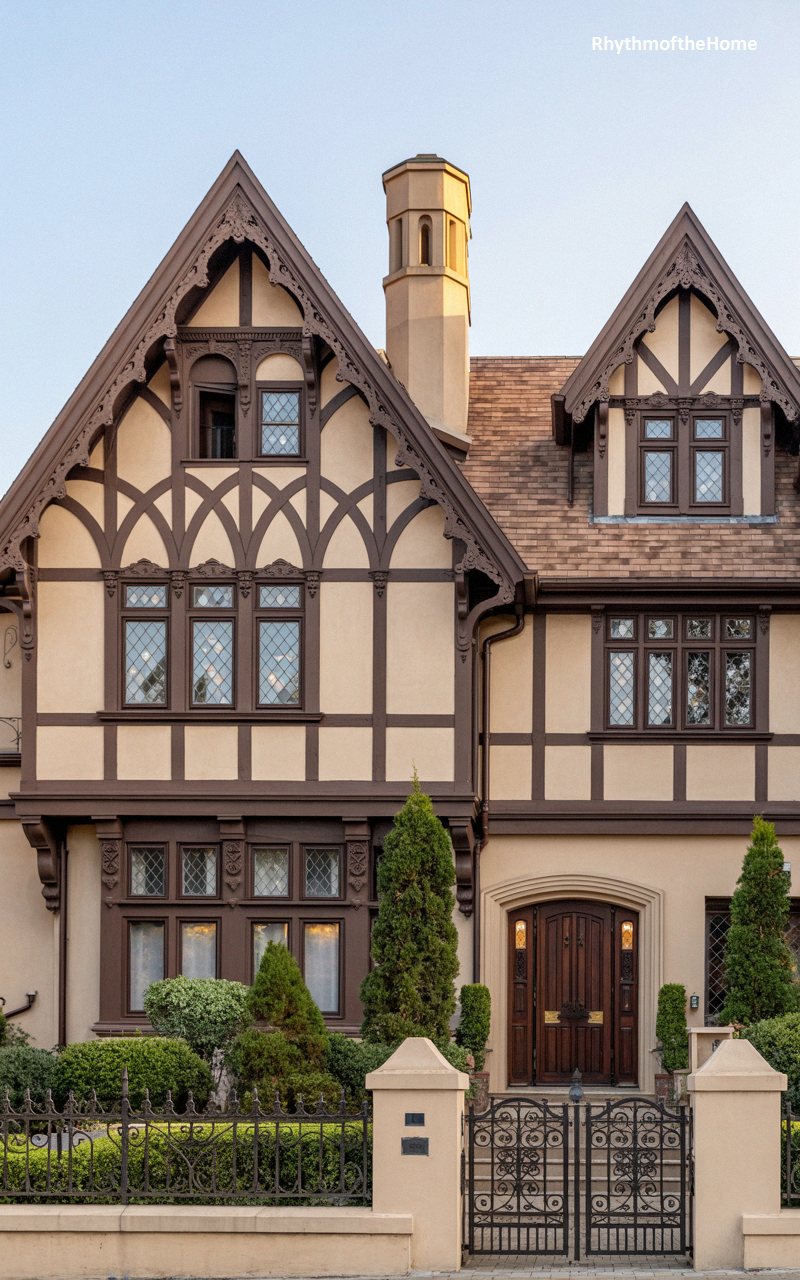 Projecting an air of formidable elegance, this large-scale residence blends smooth beige stucco with incredibly intricate, dark brown half-timbering that forms striking arches and geometric patterns across the gables. The complex roofline, clad in textured slate tiles, is punctuated by a tall, sleek chimney. A magnificent set of leaded, diamond-paned windows illuminates the upper floors, adding a touch of glittering delicacy to the heavy architecture. The property is secured by an ornate, wrought-iron gate and a low masonry wall, leading to a grand, deeply recessed entryway guarded by tall, slender evergreen trees.