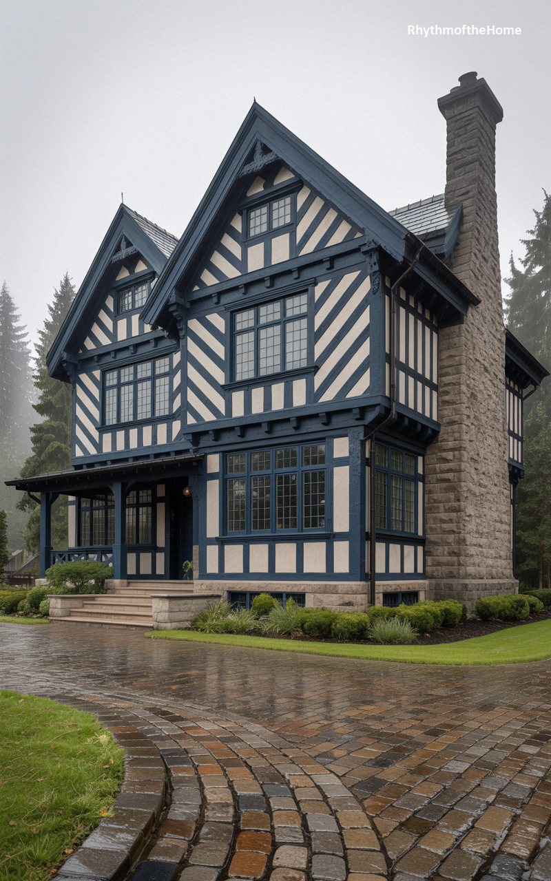 This astonishing residence makes a fearless architectural statement with its high-contrast facade, featuring stark white stucco aggressively sliced by thick, dramatic navy-blue half-timbering. The diagonal and vertical beams create a mesmerizing, almost dizzying geometric rhythm across the exterior. A massive, rugged stone chimney anchors the right side of the structure, providing a beautiful textural counterpoint to the smooth walls. The steeply pitched roof and overhanging gables shelter banks of elegant, multi-paned windows. A sweeping cobblestone driveway, glistening from a recent rain, perfectly complements the historic, old-world aesthetic of this remarkably preserved estate.
