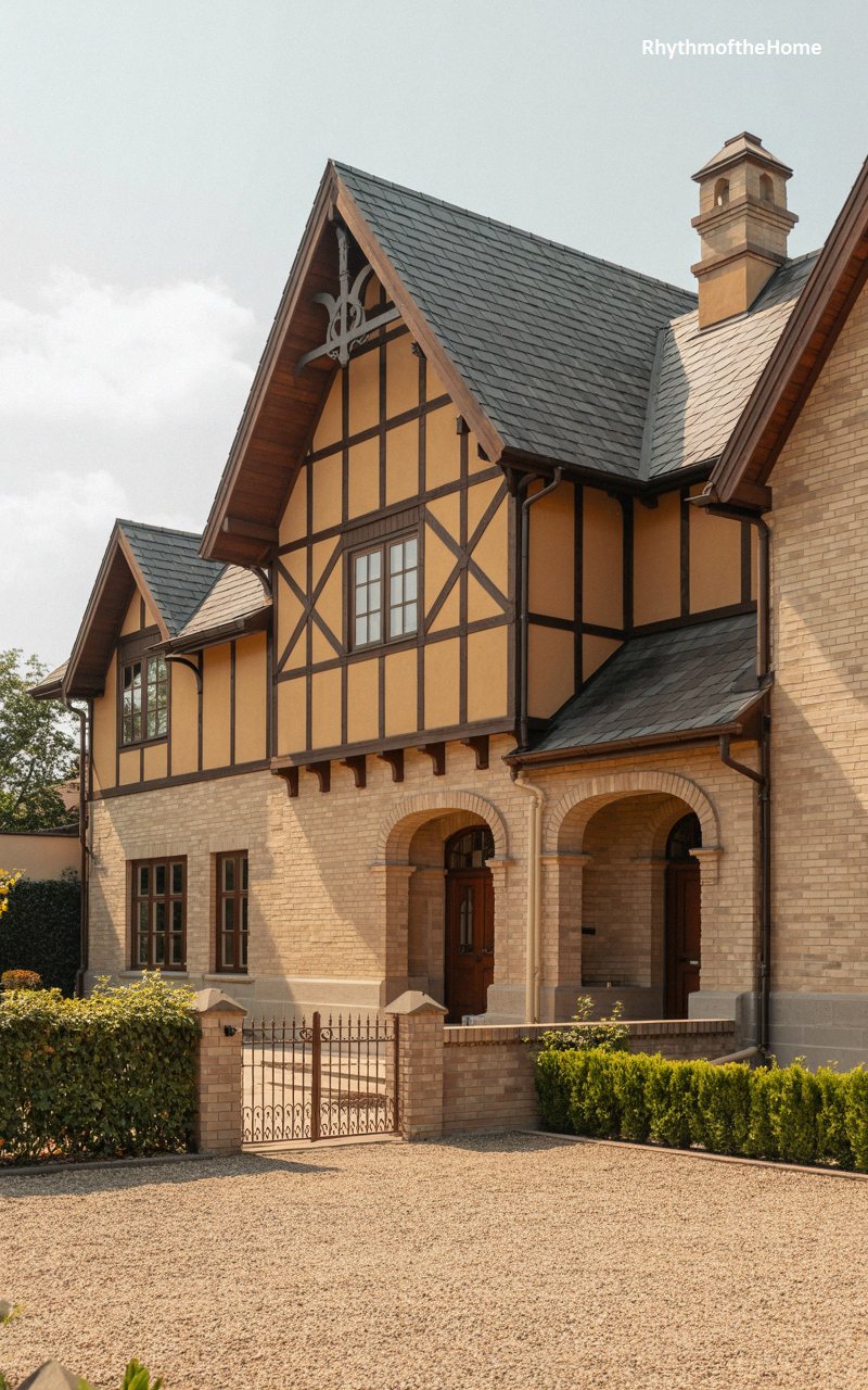 Basking in the sunlight, this inviting home features a golden-yellow stucco facade beautifully articulated by dark, structured half-timbering. The design employs a striking variety of roofline heights and steep gables, characteristic of the era’s love for complex silhouettes. A prominent feature is the beautiful, recessed porch supported by a pair of heavy, robust brick arches that create a deeply shaded, welcoming entryway. The upper windows are elegantly framed by the exposed woodwork, while a charmingly rustic brick pathway and wrought-iron gate lead the way through a meticulously maintained, sunny garden to the front door.