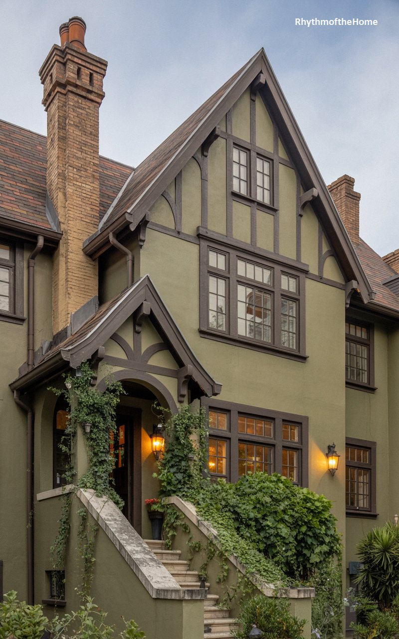 This serene, sage-green residence perfectly marries its robust architecture with the natural world. The smooth stucco exterior is broken by dark, elegant half-timbering in the prominent front gable, which extends outward to form a charming, deeply hooded entrance porch. A sturdy brick chimney runs up the side, while warm, inviting light pours from the multi-paned windows. The true magic of this home lies in the lush, untamed ivy that cascades over the entry stairs and climbs the walls, rooting the structure firmly in its verdant surroundings. It stands as a peaceful, historic retreat hidden behind lush greenery.