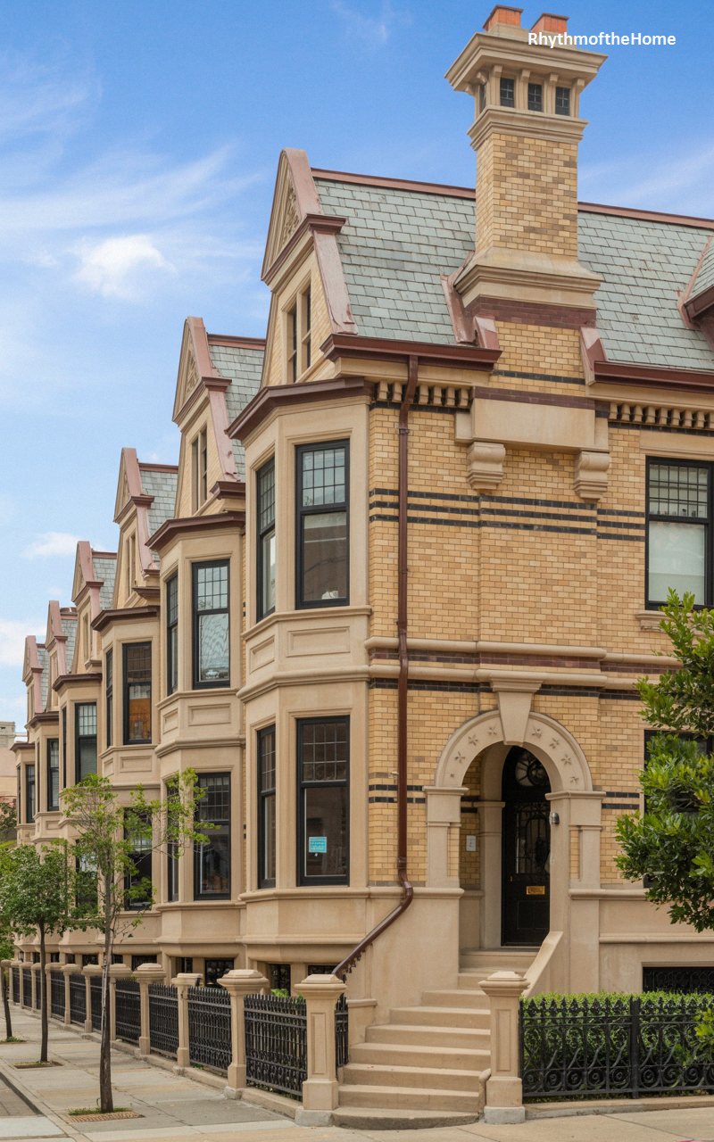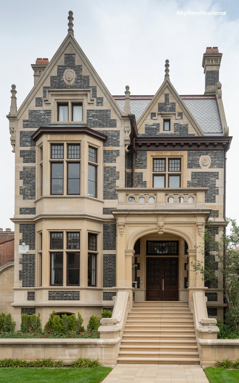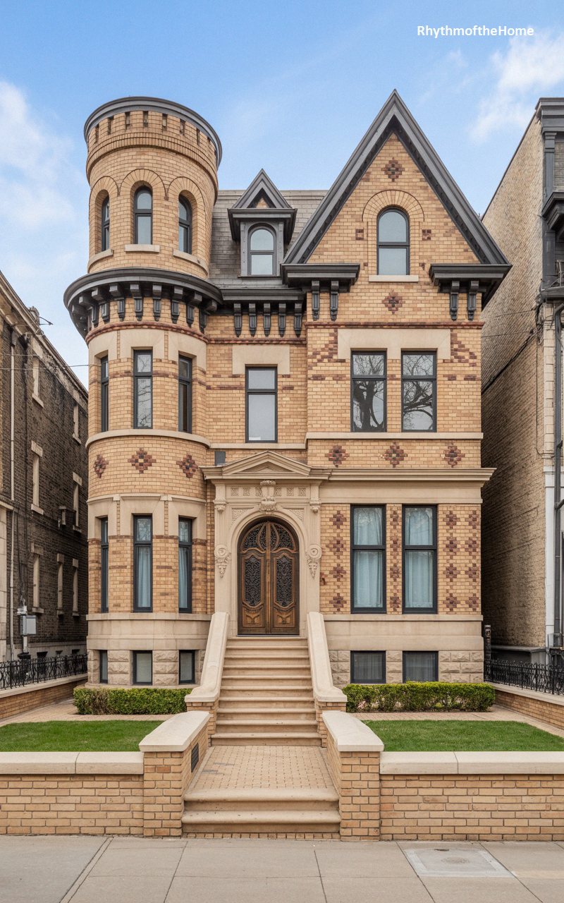 Showcasing the urban evolution of the style, this stunning rowhouse is crafted from beautiful, golden-yellow brick accented by bands of contrasting dark masonry. A dramatic, multi-story bay window extends vertically, maximizing natural light and offering sweeping views of the city street. The incredibly ornate entrance features a heavy, sculpted limestone archway with intricate floral carvings, leading to a deeply recessed, dark wood door. A steep, slate-tiled roof with a prominent gable crowns the structure. Behind a classic wrought-iron fence, this elegant city dwelling exudes the wealth and sophisticated craftsmanship of the late nineteenth century.