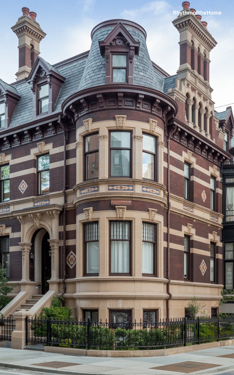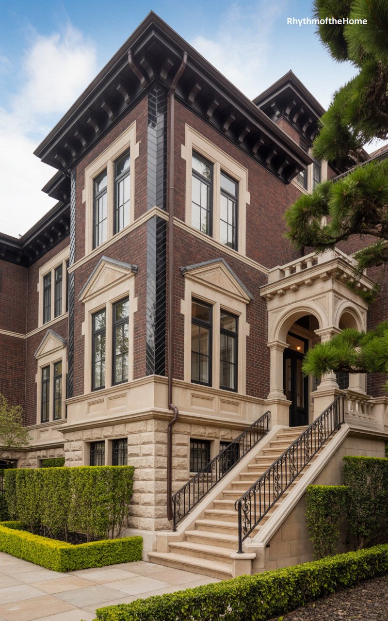 Commanding its urban corner lot, this imposing residence is built from dark, chocolate-brown brick perfectly offset by smooth, pale limestone trim. The facade is a masterpiece of verticality, featuring tall, elegant windows and a striking corner bay that stretches up toward the heavily bracketed, overhanging cornice. The grand entrance is accessed via a sweeping flight of stone steps, leading to a beautiful, arched portico supported by classical columns. Dark, glossy tiles arranged in vertical bands add a subtle, sophisticated texture to the exterior walls, making this home a formidable example of high-style city living.