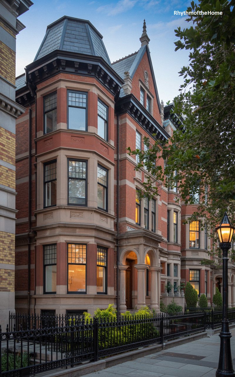 Exuding warmth and historic elegance, this classic red brick townhouse stands beautifully among its peers. The facade is defined by a sweeping, multi-story bay window that bows gracefully over the street, built with smooth, flawless masonry and highlighted by crisp, pale stone bands. Warm, golden light spills from the tall, elegant windows, offering a glimpse of the inviting interior. The deeply recessed entryway features a spectacular, heavily carved stone arch supported by stout columns. A classic wrought-iron fence guards a small, vibrant patch of greenery, completing this quintessential, deeply romantic urban Victorian scene.