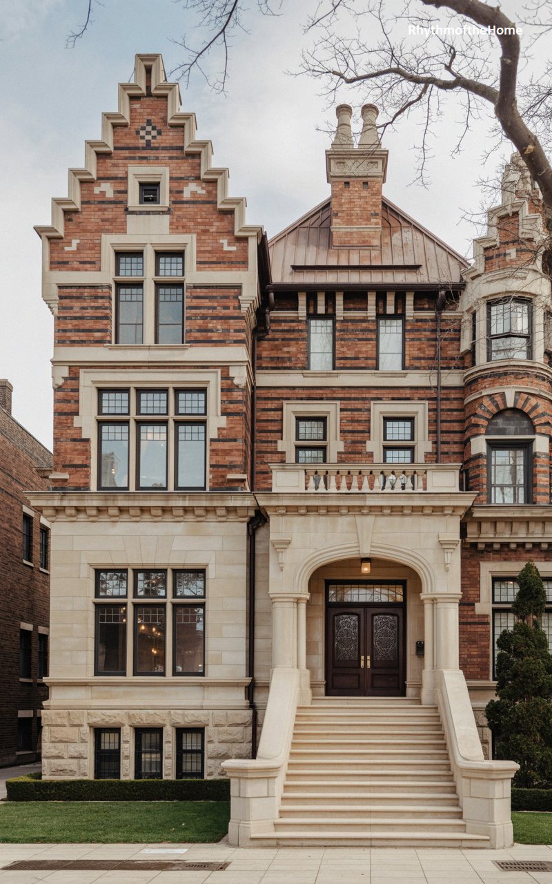 Drawing heavy inspiration from European Renaissance traditions, this spectacular urban residence features a breathtaking, stepped Flemish gable that dominates the skyline. The facade is an intricate tapestry of red and dark brown bricks, woven together with bold, horizontal bands of smooth white limestone. A sweeping, grand staircase leads to a deeply set, beautifully carved arched entryway, securing an exquisite set of dark wooden double doors. Above, an elegant stone balcony provides a luxurious outdoor space. The incredibly detailed masonry and dramatic silhouette make this home a true architectural showpiece in its historic neighborhood.