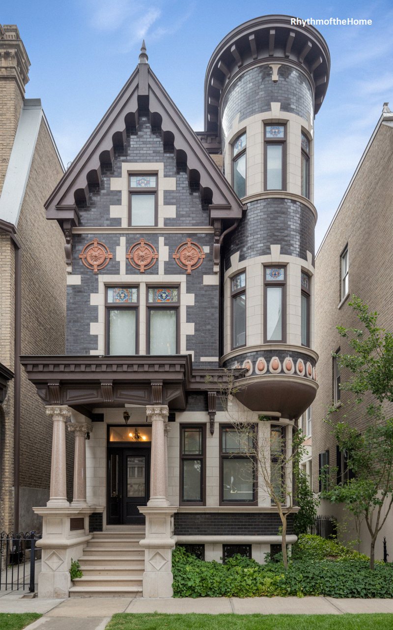 This jaw-dropping urban residence is a masterclass in ceramic and masonry detailing. The dark, charcoal-hued brick facade is dramatically accented by a towering, circular corner bay covered entirely in glossy, deeply textured tiles. Vivid, rust-colored terra cotta medallions feature intricate floral motifs, adding bursts of color and artistry to the dark exterior. A magnificent, deep front porch is supported by polished stone columns and features an incredibly detailed, sculpted frieze. This highly eclectic, wildly creative structure perfectly encapsulates the Victorian era’s desire to push the boundaries of texture, color, and architectural ornamentation.