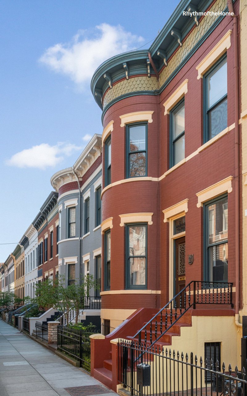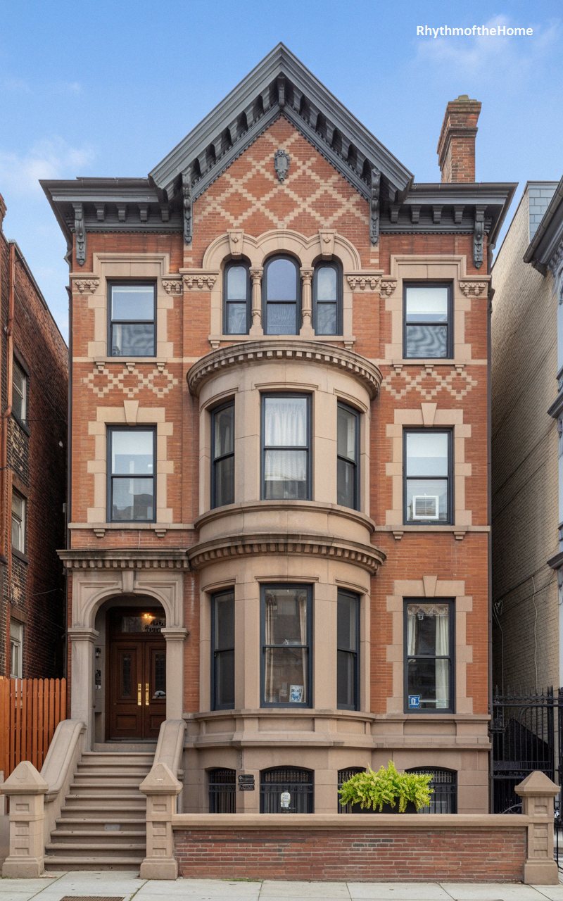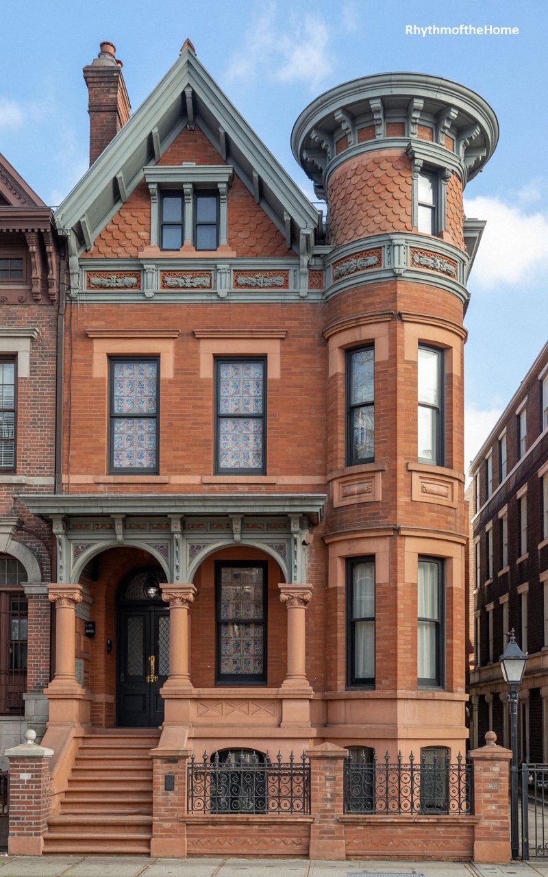 Nestled seamlessly into a vibrant historic neighborhood, this beautifully preserved townhouse boasts a rich, red-brick facade that radiates classic urban warmth. The defining feature is the elegant, sweeping curve of the multi-story bow window, a hallmark of city-adapted Victorian design. Soft cream trim highlights the window frames, while a highly ornate, deep-teal cornice line with decorative brackets caps the structure. A traditional wrought-iron railing guides the way up the painted masonry steps to the beautifully detailed, heavy wooden front door. This residence stands as a proud, enduring symbol of late-nineteenth-century metropolitan elegance and architectural grace.