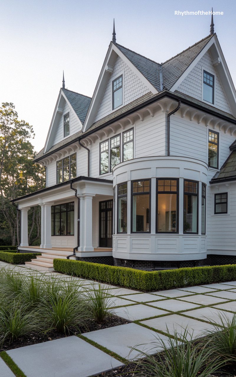 This striking interpretation of a classic style features a crisp white shiplap exterior accented by bold black window frames and trim. Sharp, steeply pitched gables are crowned with elegant finials, drawing the eye upward toward the grey slate roof. A prominent, smoothly curved bay window dominates the ground floor, offering expansive views and a gentle contrast to the sharp architectural lines above. The traditional wraparound porch is supported by sturdy, simplified columns. A contemporary walkway constructed of large, pale concrete pavers separated by vibrant green grass completes this fresh, sophisticated update on Victorian-era design.