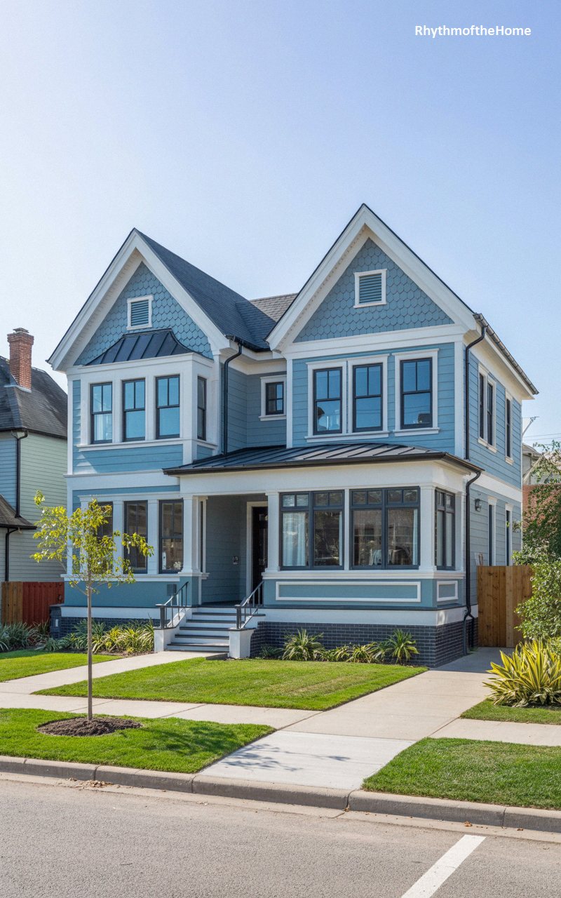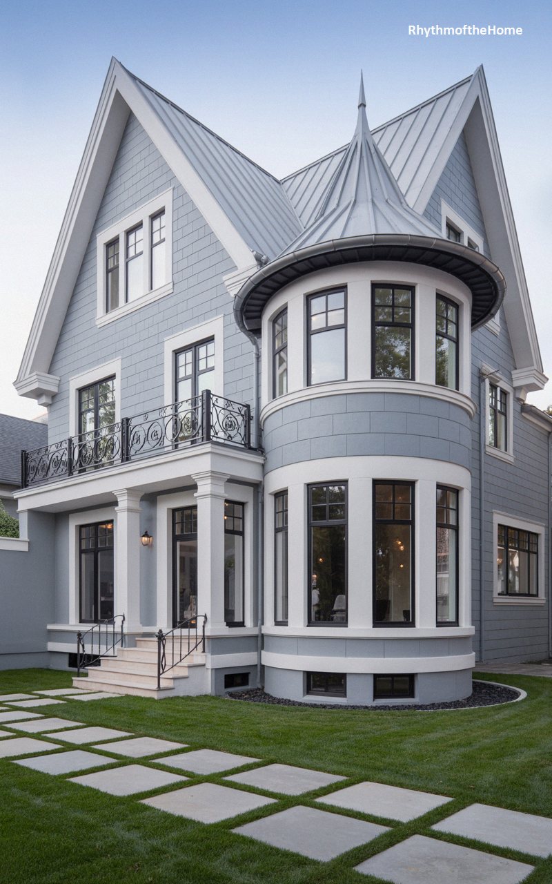 A beautiful pale blue-grey facade provides a serene backdrop for the dramatic architectural features of this residence. The eye is immediately captured by the sweeping curves of a prominent corner turret, capped with a steeply pitched, seamed metal roof that echoes the sharp gables of the main structure. Intricate wrought-iron railings adorn a delicate second-story balcony, adding a touch of romantic Victorian flair above the crisp white columns of the front entry. Bold black window casings add a modern graphic punch, while a meticulously landscaped lawn and paver pathway ground the airy, elegant design.