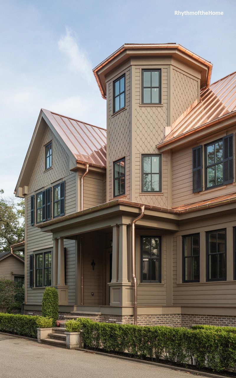 Radiant copper roofing transforms this architectural beauty into a glowing masterpiece, especially where it caps the striking square tower and the welcoming front porch. The exterior is clad in warm, sandy beige siding, featuring a charming mix of horizontal planks and decorative fish-scale shingles nestled within the steep gables. Dark, almost black, traditional shutters frame the vertically proportioned windows, providing a sharp, anchoring contrast to the warm metallic hues above. Gleaming copper downspouts cascade elegantly down the sides, blending utility with artistry. A manicured brick walkway and neatly trimmed boxwood hedges complete this refined, classically inspired estate.