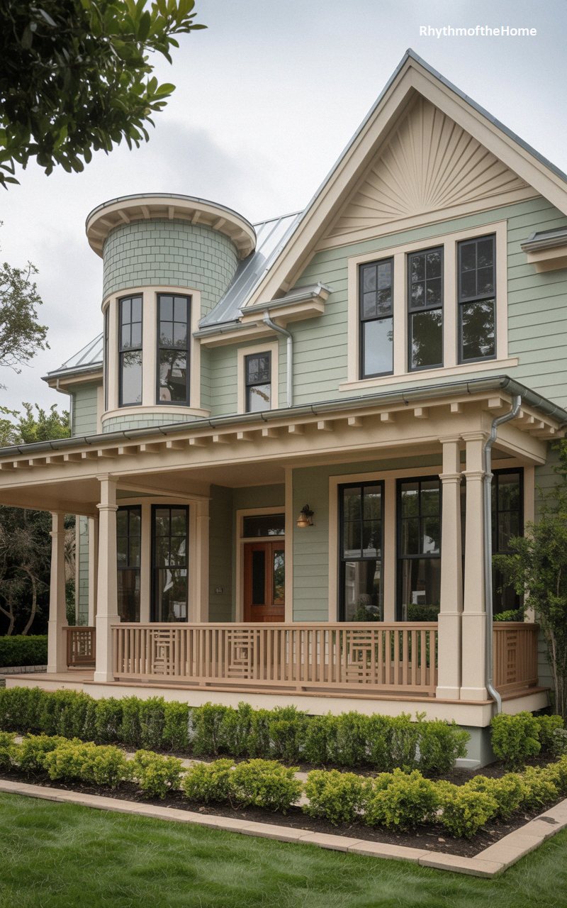 Exuding a soft, historical charm, this residence is painted in a soothing sage green paired with warm cream trim. The defining feature is a spectacular sunburst motif intricately carved into the main front gable, a hallmark of exquisite Victorian craftsmanship. To the left, a rounded corner tower with curved glass seamlessly integrates into the structure, offering panoramic views from within. The expansive front porch boasts a unique geometric railing design and exposed rafter tails, adding a touch of Craftsman influence to the Queen Anne silhouette. Lush, low-lying greenery lines the foundation, enhancing the home’s welcoming, organic appeal.