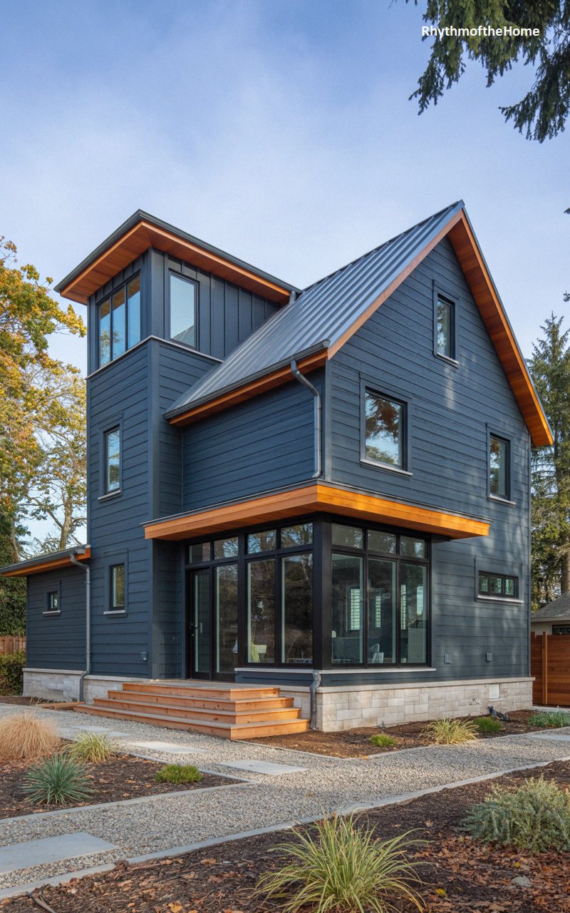 Striking a bold pose against a clear sky, this contemporary reimagining utilizes a moody, dark charcoal-blue siding that instantly modernizes the classic multi-level silhouette. A prominent square observation tower rises on the left, offering a commanding presence. Vibrant, natural wood planks line the undersides of the steep roofs and the modern flat-roofed porch extension, injecting profound warmth into the dark exterior. Massive, black-framed windows flood the interior with light, completely updating the traditionally segmented Victorian floor plan. A textured base of light-colored stone and a minimalist gravel courtyard firmly root this edgy, modern masterpiece in its environment.
