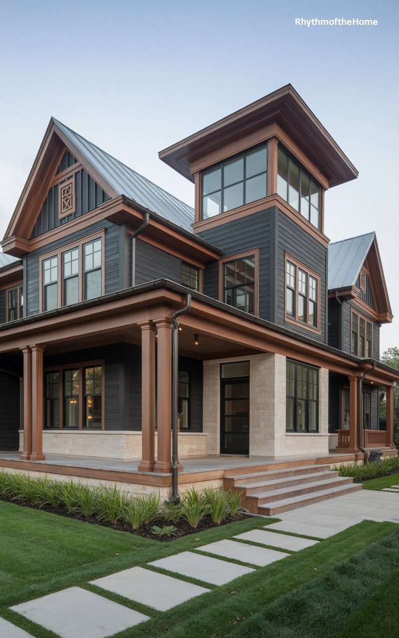 A moody, dramatic atmosphere surrounds this striking residence, clad in deep charcoal siding with rich, natural wood-toned trim outlining every architectural detail. A prominent, flat-topped observation tower rises majestically above the central roofline, enclosed entirely by large glass panes. The robust wraparound porch features thick, beautifully stained wooden columns resting upon a solid foundation of rough-hewn, light-colored stone blocks, providing a powerful contrast. A durable standing seam metal roof covers the complex arrangement of gables and towers. The thoughtful integration of dark hues and warm timbers creates a sophisticated, rustic interpretation of classic Victorian grandeur.