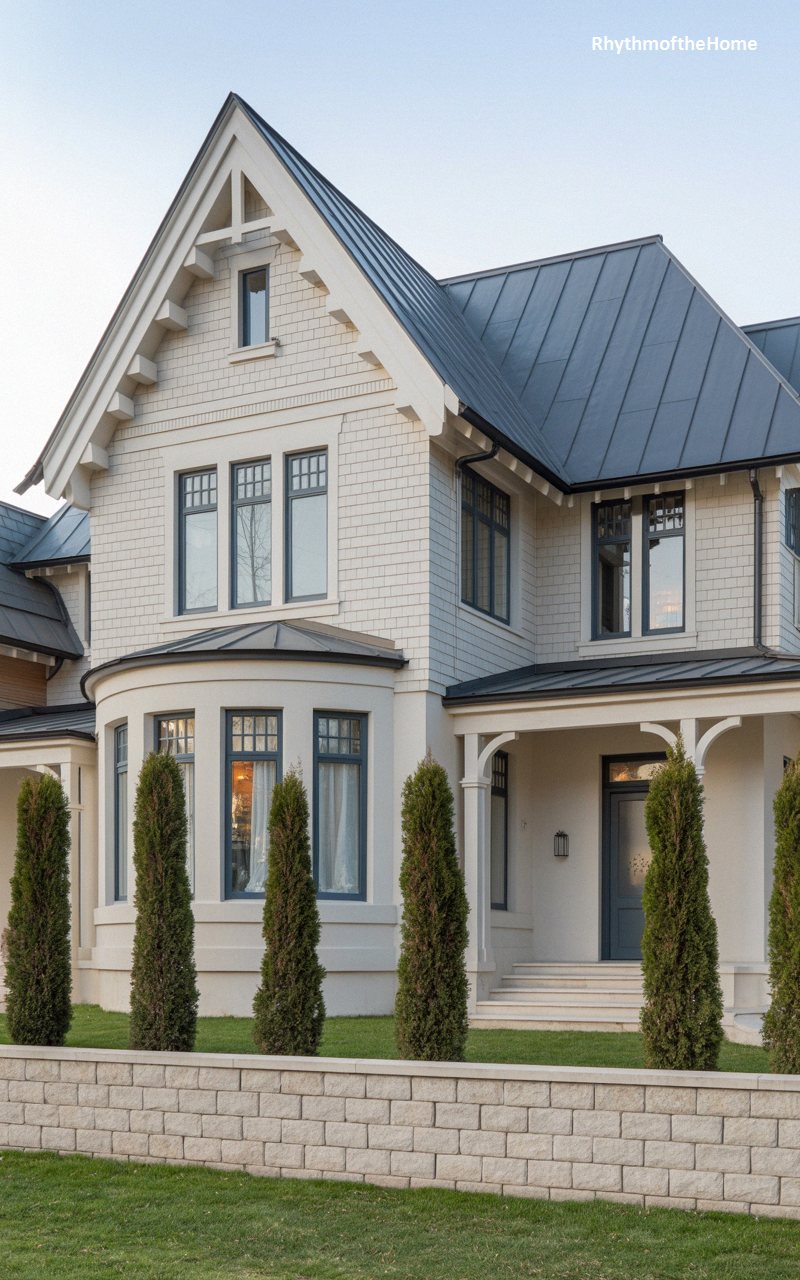 Crisp, clean, and imposing, this creamy off-white home showcases a masterclass in texture with its exterior beautifully clad in uniform rectangular shingles. The steeply pitched dark metal roof provides a stark, handsome contrast, highlighted by the intricate wooden truss work exposed within the soaring front gable. A smoothly rounded bay window curves gracefully outward on the ground floor, softening the sharp angles above. Dark blue-grey window frames add subtle depth to the facade. Three incredibly tall, slender evergreen trees stand like sentinels in front of the pale brick retaining wall, adding vertical drama to the elegant landscaping.
