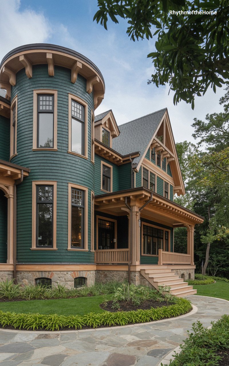 Immersed in nature, this breathtaking home features a deep, vibrant forest green shingled exterior that beautifully harmonizes with its lush surroundings. The prominent multi-story rounded turret is capped with decorative corbels beneath its overhanging roofline. Extensive natural wood-toned trim highlights the intricate window casings and the elaborate framework of the generous wraparound porch, complete with exposed rafters and a classic spindled railing. Black window sashes add a sharp, sophisticated edge. The entire structure rests gracefully on a rustic foundation of varied, multi-colored stonework, approached via a sweeping walkway crafted from irregular, organic flagstones.